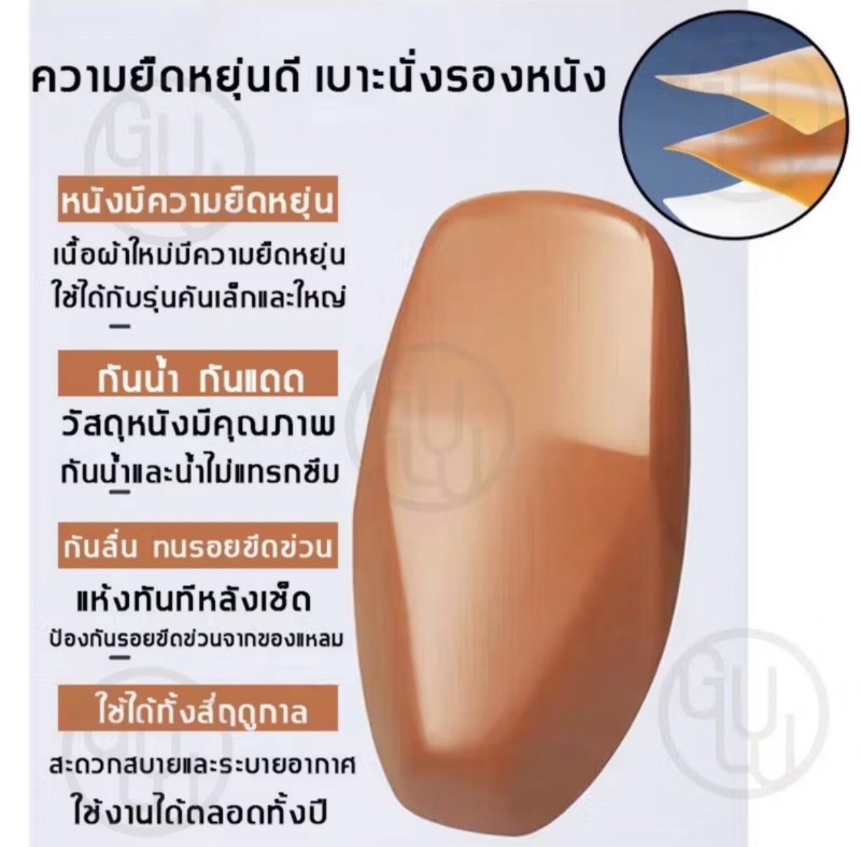 พื้นผิวทนทานกันน้ำ 100% ป้องกันฝนและความชื้น. ฐานกันลื่นช่วยให้เบาะอยู่ในตำแหน่งที่มั่นคง. ทนความร้อน 100% ทำให้เบาะเย็นสบายระหว่างตากแดด.
