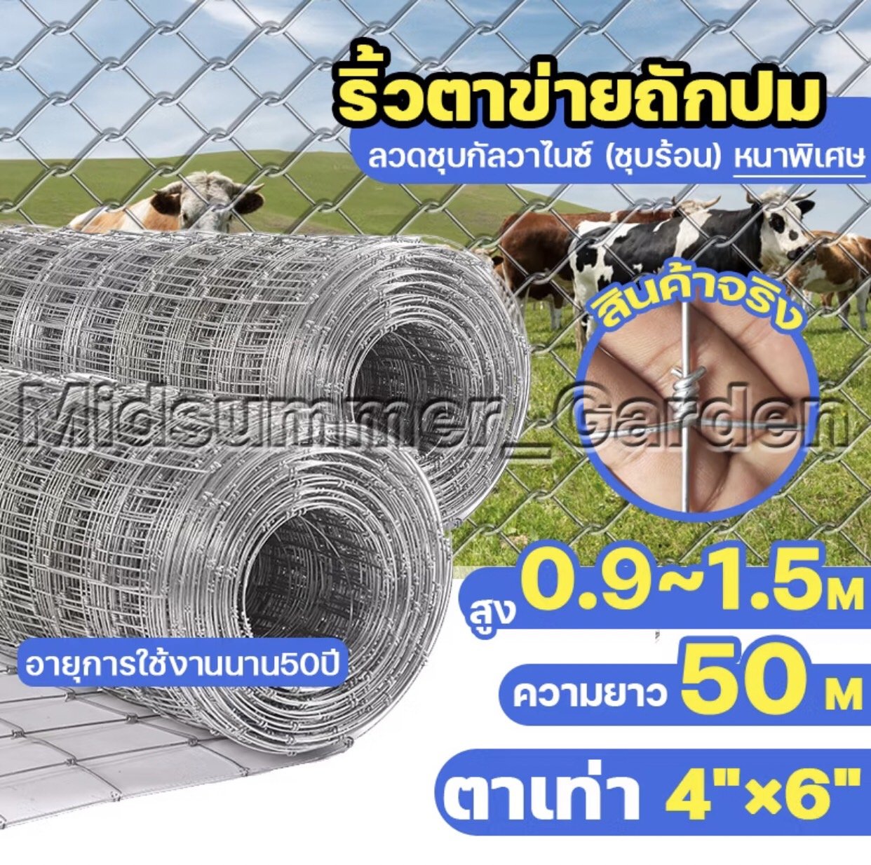 รั้วถักปม/รั้วตาข่ายแรงดึง 0.9x50m ลวดหนา1.8mm ลวดตาข่ายถักปม ลวดเหล็กล้อมรั้ว รั้วล้อมไร่สวน รั้วล้อมคอกสัตว์ วัว แพะ(รั้วถักปม/รั้วตาข่ายแรงดึง 15cm 4x6